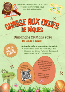 Le Cgrs Saffré, l’OGEC Saint Joseph Saffré et l’Amicale Laïque Saffré vous donnent rendez-vous pour la traditionnelle chasse aux oeufs de Pâques !